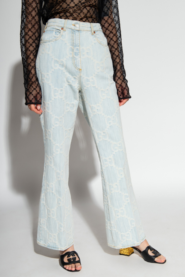 Light blue high-waisted jeans from Gucci. Fastened with a zip and button, this pair is complete with an embroidered monogram pattern in white, logo patch at the back, three front pockets, two back pockets and flared legs.