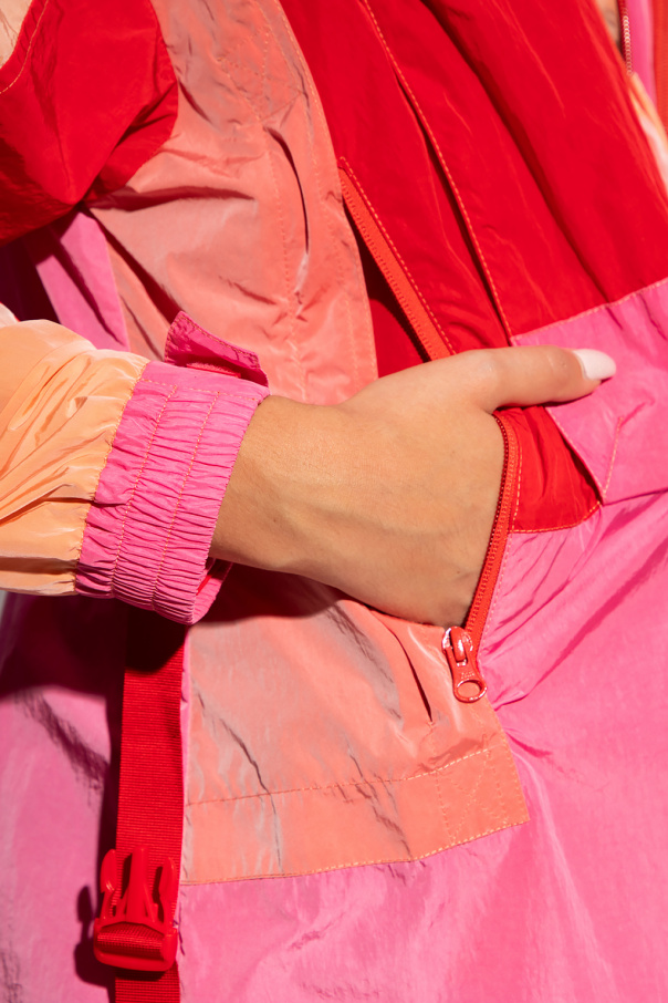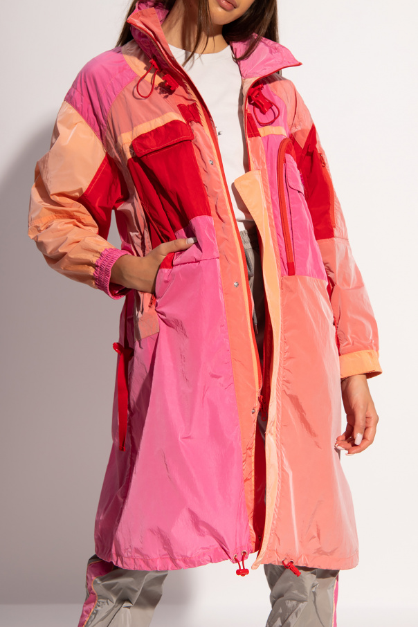 Pink, orange and red coat from Stella McCartney. Crafted from recycled material – ECONYL®, this style features a zipper, hidden snap closures, a waist-cinching tape with a press-stud, a rubber logo appliqué on the front, a concealable drawstring hood, three zipped pockets, two velcro pockets and long sleeves with velcro adjusters and elasticated cuffs.