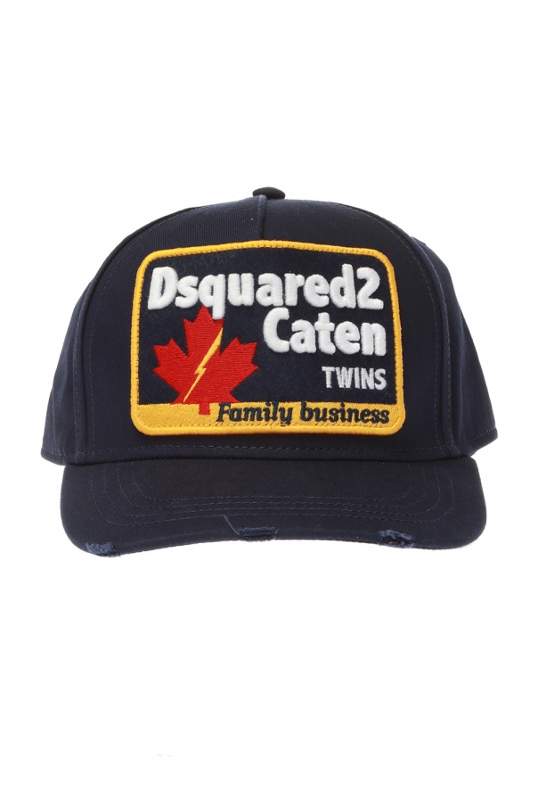 Navy baseball cap from Dsquared2. Made of cotton. Decorated with a logo patch in yellow, white and red. Raw trim. Adjustable strap at the back.