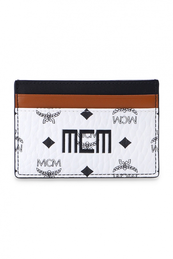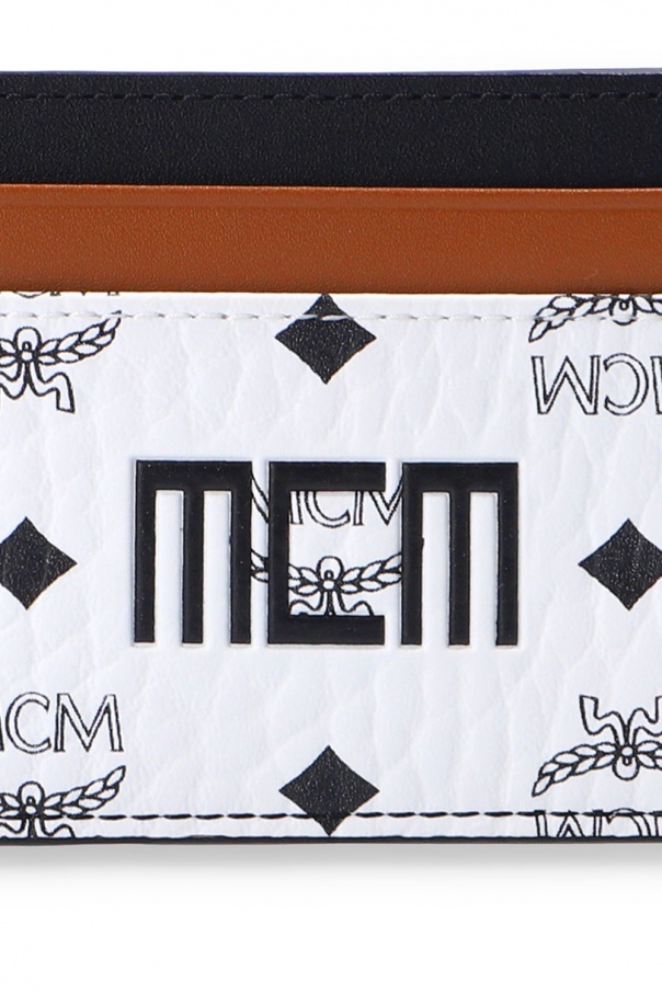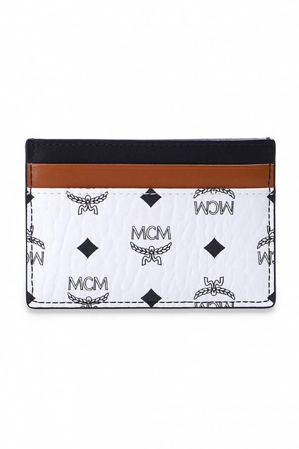 White, brown and black card holder from MCM. Decorated with a logo, this item features five card slots.
