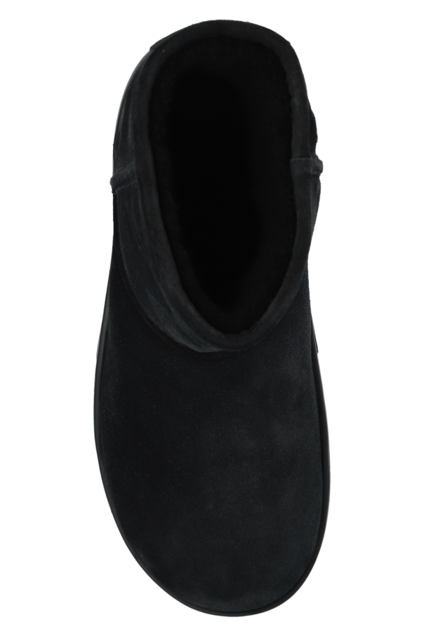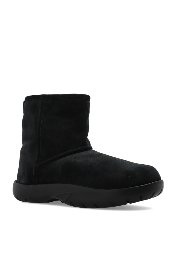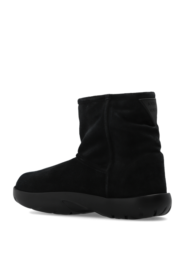 Black ‘Snap’ snow boots from Bottega Veneta. Made from suede and lined with fur, this model features a slip-on silhouette, rubber logo patch on the back and a black rubber sole at the base.