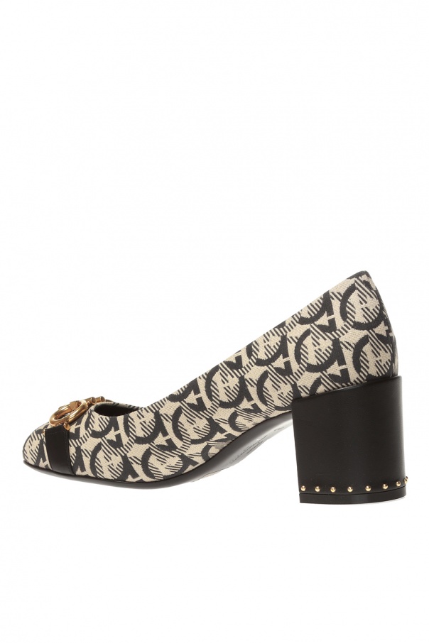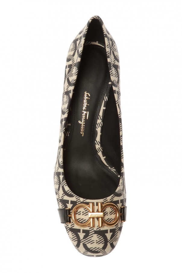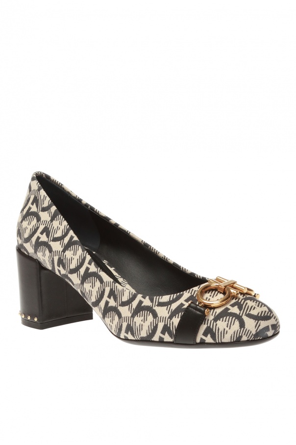 Beige and grey ‘Garda’ pumps from Salvatore Ferragamo. Embellished with woven black pattern with logo. Feature leather strap with a signature antiqued gold-tone ‘Gancini’ metalware on the upper front and black sole in leather.