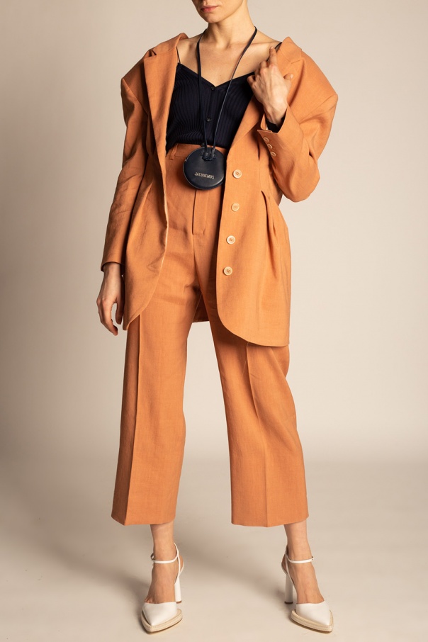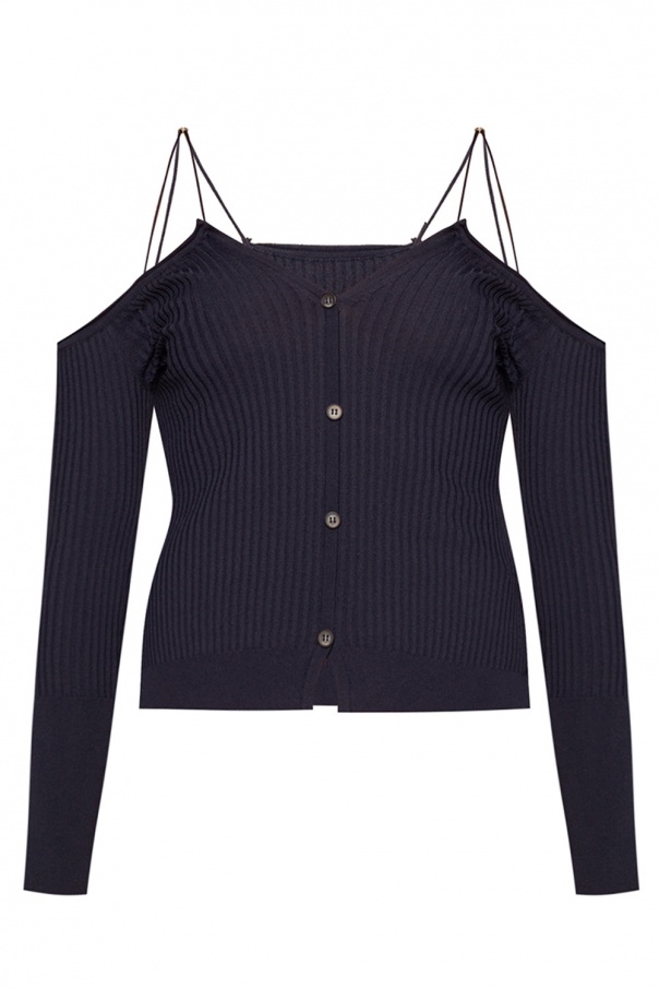 Navy blue ‘Tordu’ cardigan from Jacquemus. Crafted from ribbed knit, this style fastens via buttons and features denuded shoulders, double, fine shoulder straps and long sleeves with decorative slits.