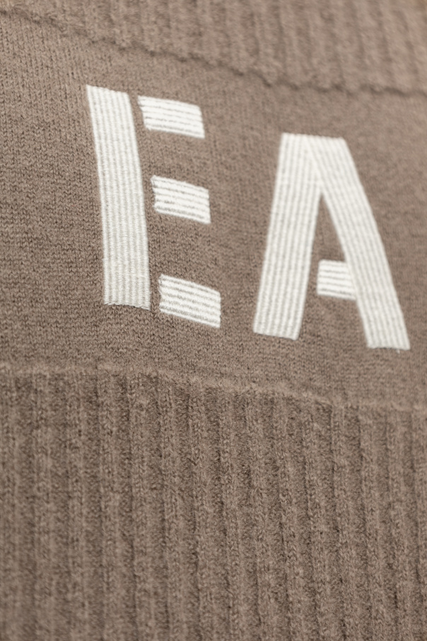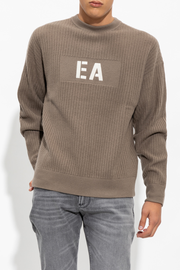 Greyish beige sweater from Emporio Armani. Made of a wool blend, this round neck design features a white logo embroidery and ribbed trims.