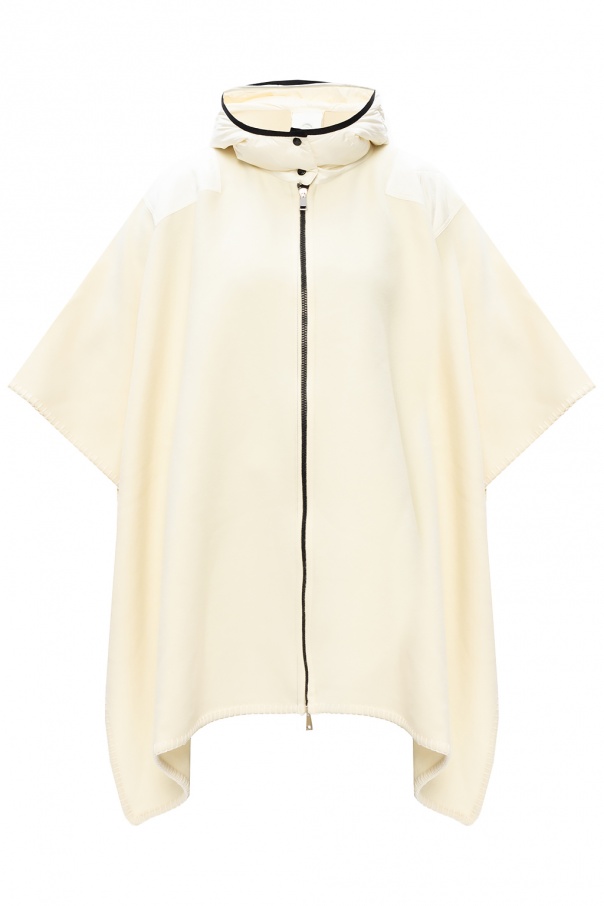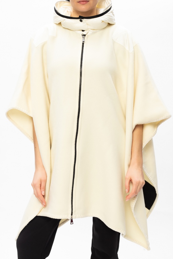 Cream poncho from Moncler. Emblazoned with a black logo pattern, this wool-crafted style fastens via a zip and features a hood with snap closures, tabs on the sides and decorative, glossy inserts.