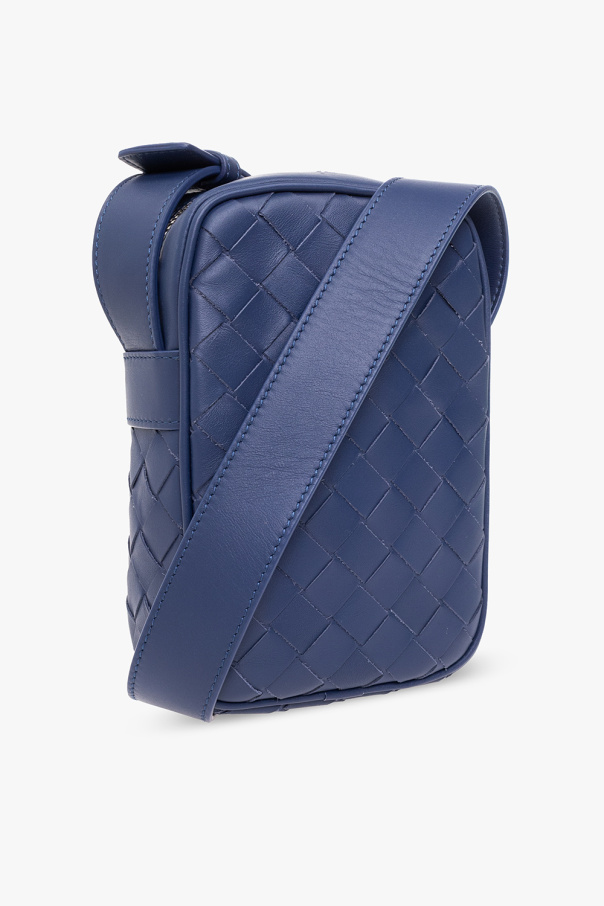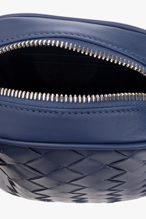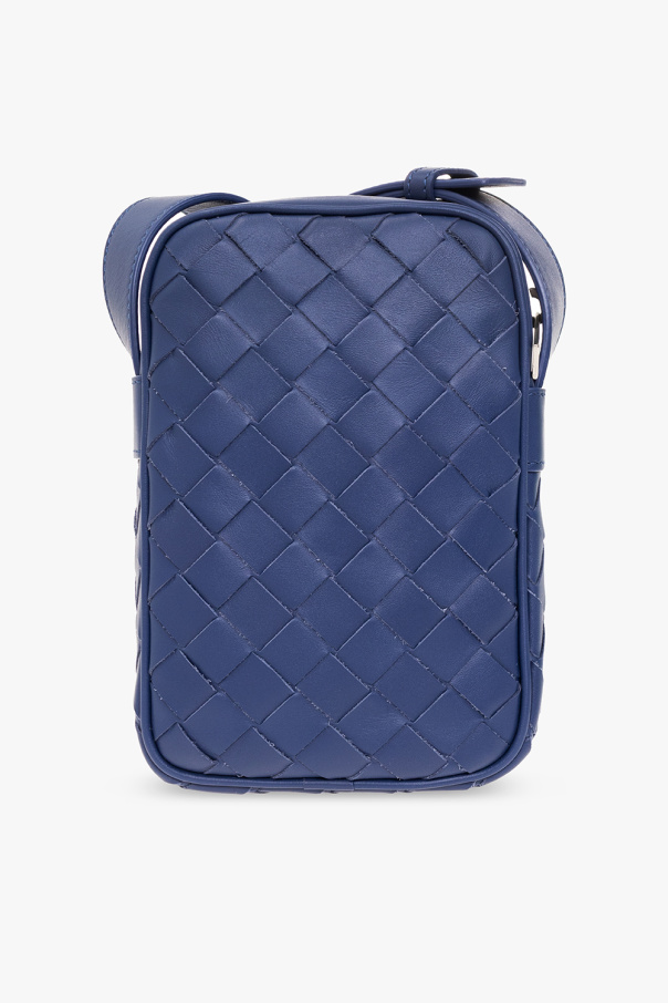 Navy phone pouch from Bottega Veneta. Made of calf leather with the brand's signature Intreccio weave, this item features a zip fastening, adjustable shoulder strap and one internal compartment with three card slots.