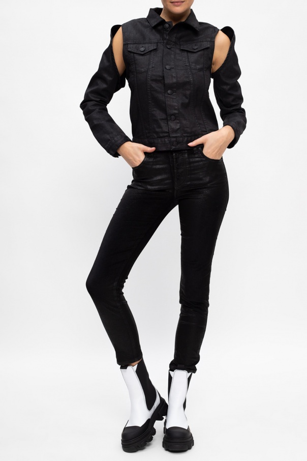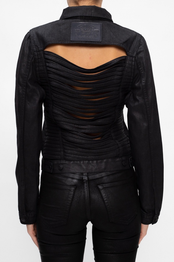 Black ‘De-Baranco’ waxed denim jacket from Diesel. Fastened with buttons, this garment is complete with two buttoned flap pockets and decorative slits.