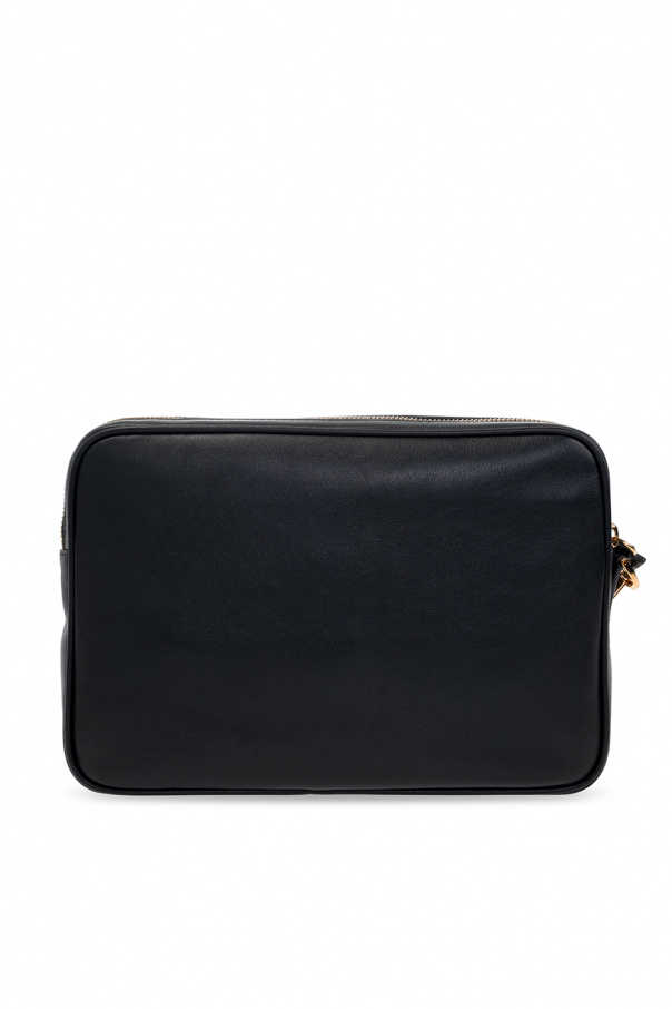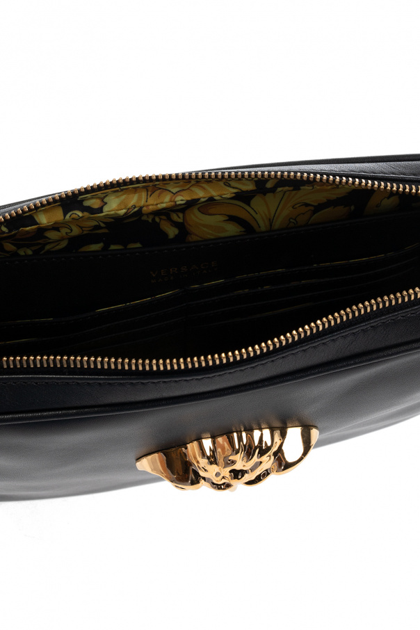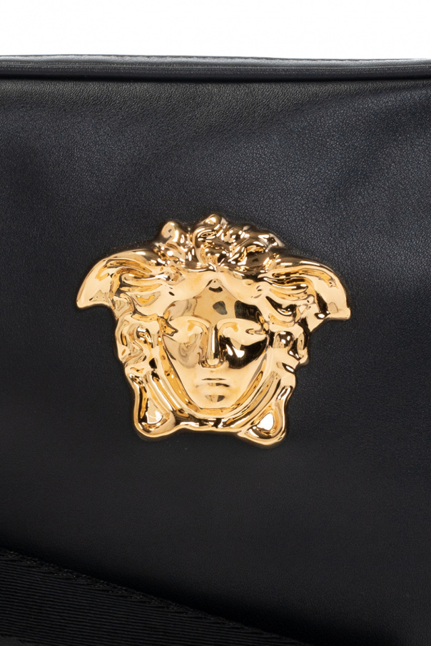 Black ‘La Medusa’ hand bag from Versace. Crafted from leather, this design features a zip fastening, Medusa head appliqué in gold-tone, detachable wrist strap, gold-tone metal hardware and one internal compartment with one slip pocket and eight card slots.