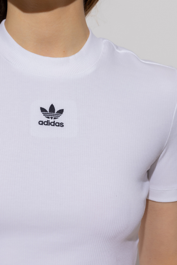 White ribbed top from ADIDAS Originals. This short sleeve design has a ribbed crew neck and is embroidered with a logo pattern in black.