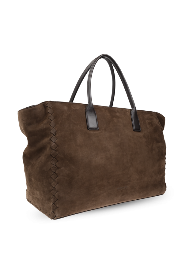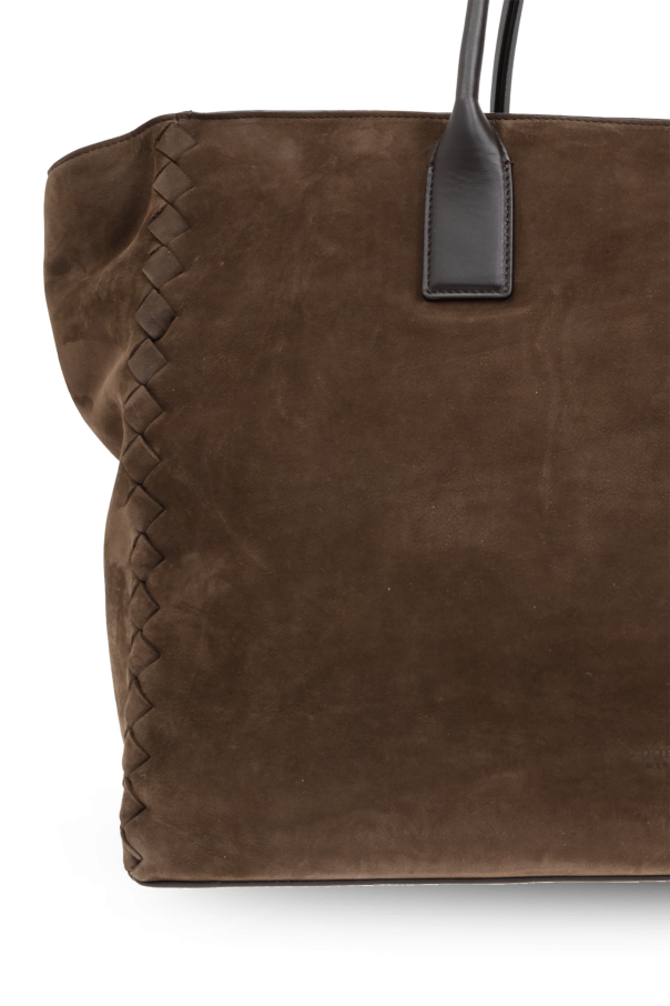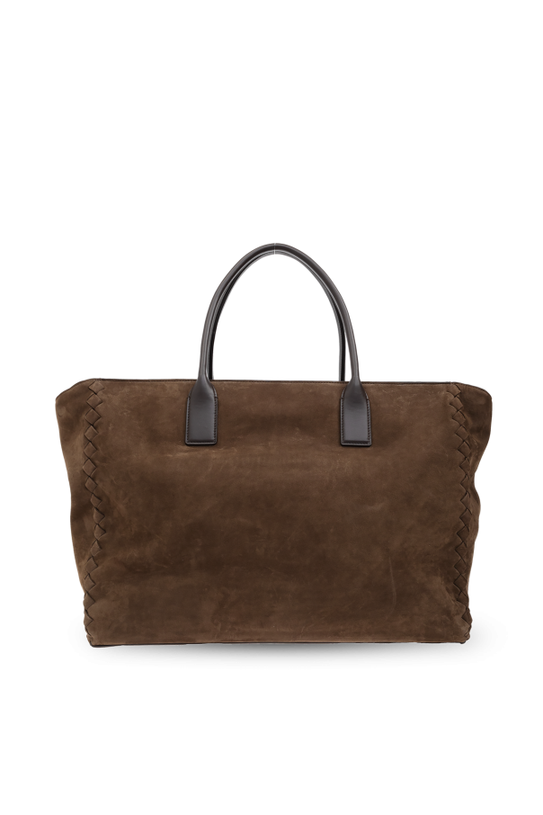 Introducing the Suede Shopper Bag by Bottega Veneta, an epitome of sophistication and luxury. Crafted from the finest dark brown suede, this bag exemplifies elegance and high-quality craftsmanship. The rectangular shape, with subtly rounded edges, offers ample space, making it perfect for everyday use. The bag features two robust black handles, affixed with rectangular leather patches, ensuring comfortable hand-carrying. Distinctive braided patterns adorn the sides, adding a unique and stylish touch. The spacious interior, also lined with suede, underscores the exclusive nature of this accessory. A dual zipper closure secures your valuables, while the interior boasts a compartment, a zippered pocket, and two slip pockets for optimal organization. Why Purchase This Product? Designed by the renowned Bottega Veneta, a brand synonymous with superior craftsmanship and innovation since 1966. High-quality dark brown suede material offers a luxurious and durable finish. Elegant and spacious design suitable for various occasions. Secure dual zipper closure for added protection of your belongings. Practical interior with multiple pockets for organized storage.