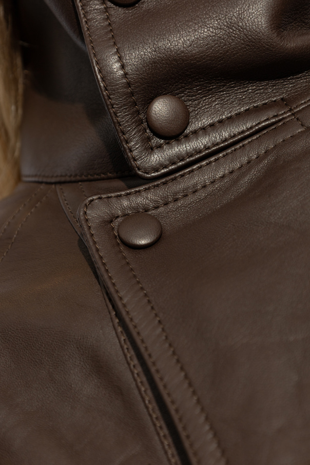 Introducing the Women's Leather Jacket by Saint Laurent, an epitome of timeless elegance and sophistication. Crafted from premium lamb leather, this jacket exudes a luxurious charm that is both versatile and enduring. The jacket features a loose fit with wide sleeves, enhancing its comfort and style. Secured with a zipper and additional snap buttons, it offers both practicality and a refined aesthetic. The high collar, which can also be fastened with snaps, provides added protection against the wind. Designed in a rich brown hue, this jacket is adorned with two large, slanted pockets at the front, each secured with snap flaps. The cuffs and hem are finished with elastic ribbing, ensuring a snug fit and additional wind resistance. The visible stitching along the sleeves and back adds a distinctive character to this elegant piece. Why Choose This Product? Expertly designed by the iconic Saint Laurent, a leader in luxury fashion since 1961. Crafted from high-quality lamb leather, offering durability and a soft touch. Timeless and versatile design suitable for both casual and formal occasions. Unique detailing such as a high collar, snap closures, and visible stitching for added flair. Elasticated cuffs and hem for better fit and wind protection.