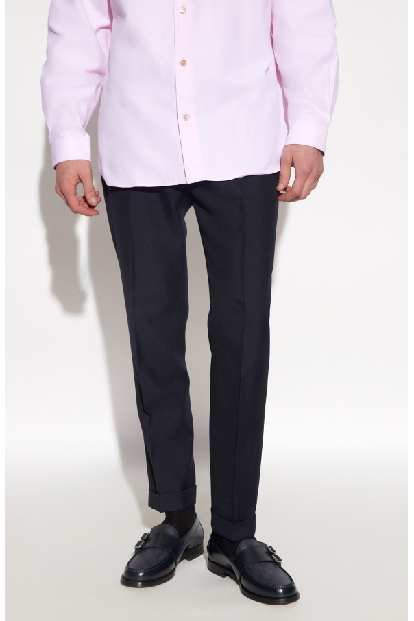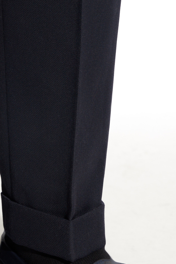 Navy pleat-front trousers from Gucci. Made from a wool blend, this pair features a zip and hook fastening, two slip pockets, two buttoned pockets and slightly tapered legs.