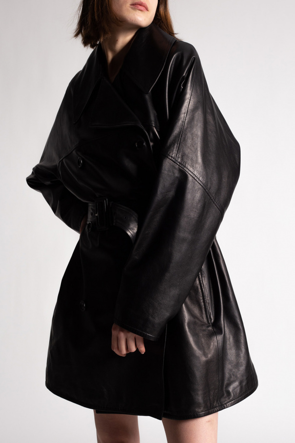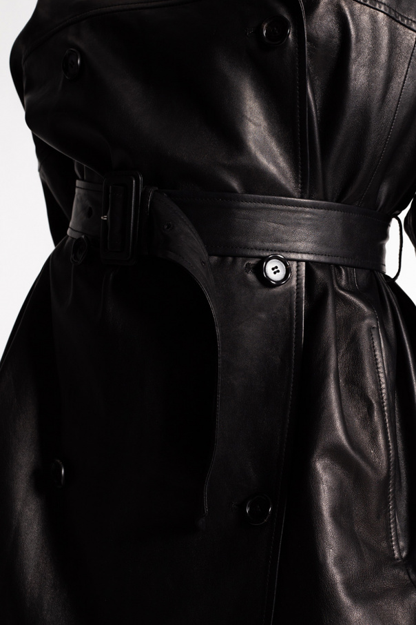 Black coat from Marni. Made of lamb leather with a double-breasted silhouette, this item features notch lapels, two pockets on the front and a cinching belt at the waist.