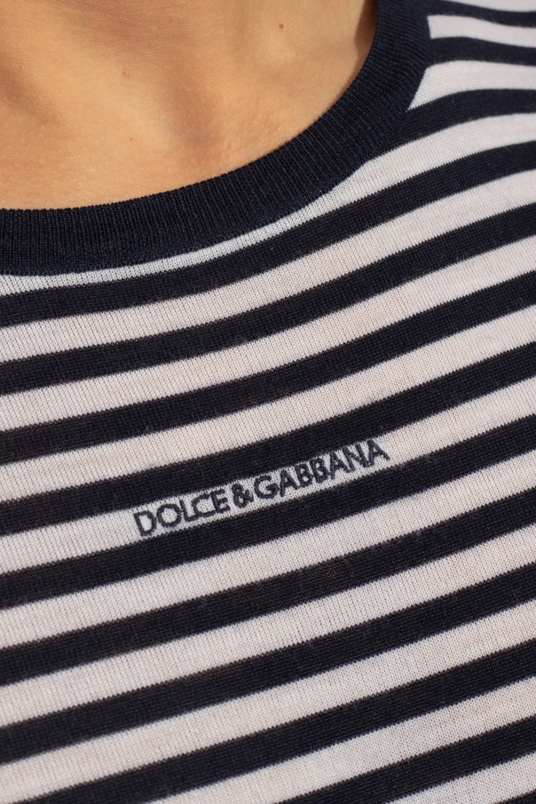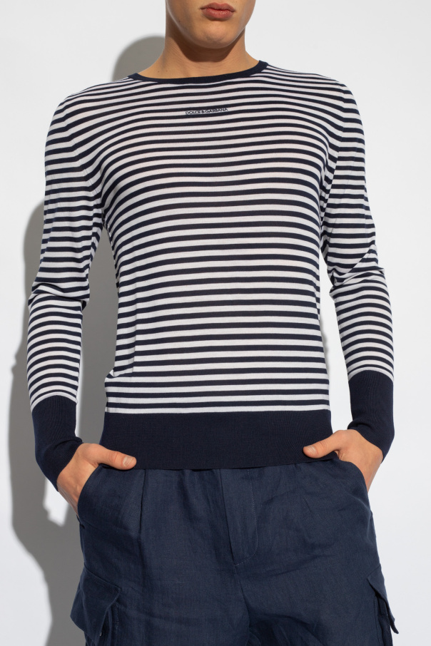 White and navy sweater from Dolce & Gabbana. Made from virgin wool, this long sleeve design features a stripe pattern, logo embroidery and ribbed trims at the crew neck, hem and cuffs.