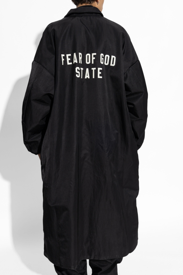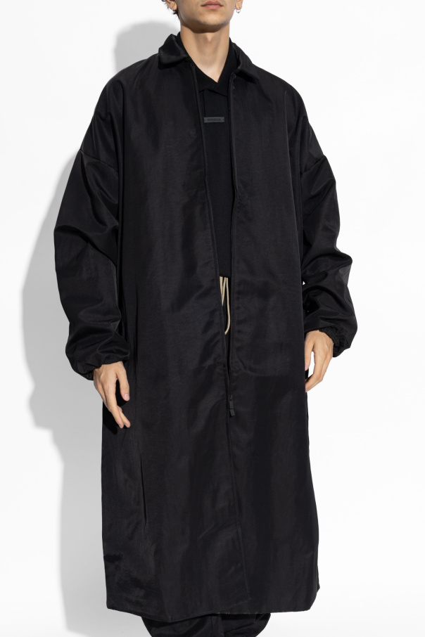 Introducing the Fear Of God Essentials Black Coat from the exclusive fashion collection. This coat, designed by Jerry Lorenzo's renowned brand, epitomizes understated luxury with its minimalist yet sophisticated aesthetic. Crafted from 100% recycled nylon, the coat boasts a smooth texture, potentially offering wind-resistant and water-resistant properties. The long, loose cut extends below the knees, providing a relaxed yet elegant silhouette. The wide long sleeves and simple collar add to the coat's modern charm. The coat features a discreet front zipper closure, enhancing its sleek and minimalist design. Notable for its unique detailing, the back displays a bold white embroidered inscription, "FEAR OF GOD STATE," adding a touch of refined distinction. With elasticated cuffs, the sleeves offer enhanced protection against the wind, while the absence of visible front pockets underscores the coat's clean and sophisticated look. Hidden within are two convenient pockets, maintaining functionality without compromising the coat's elegant design. Why Choose This Product? Luxurious Material: Made from 100% recycled nylon, combining sustainability with high-end fashion. Elegant Design: Simple yet sophisticated, perfect for both casual and formal occasions. Distinctive Detailing: Features an embroidered brand statement for a unique touch. Functional Elements: Elasticated cuffs and hidden pockets for practicality and comfort.