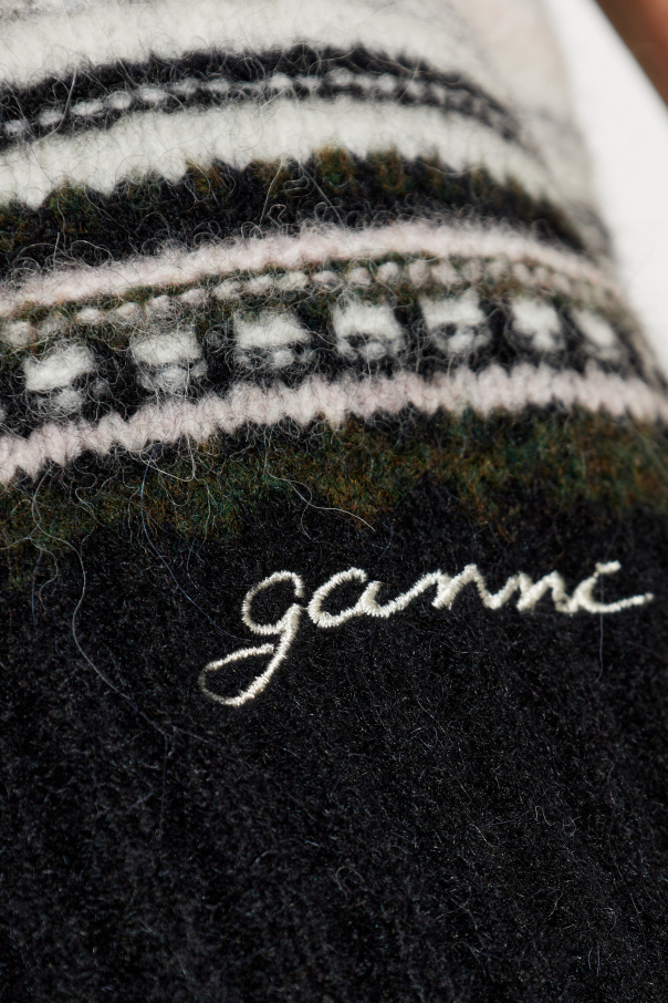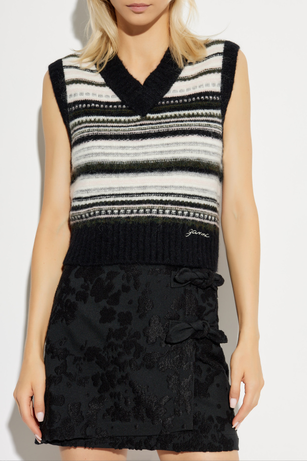 Introducing the Striped Pattern Vest from the exclusive collection by Ganni. This classic sleeveless vest, designed with a refined silhouette, is a testament to the brand's commitment to timeless elegance infused with a modern twist. The vest features a striking striped pattern in varying shades of black, white, and green, creating a harmonious and symmetrical design. Crafted from a soft knit fabric, it promises both comfort and style, making it an essential addition to any wardrobe. Details such as the deep V-neckline and the embroidered "Ganni" logo in white on the lower left side add a touch of sophistication. The vest's primary color is black, complemented by white and green stripes, and it is finished with broad ribbed trims around the hem, neckline, and armholes, providing structure and shape. Why Buy This Product? Exceptional Design: The blend of classic and casual elements makes it versatile for various occasions. Premium Materials: Made from a luxurious blend of wool, alpaca, polyamide, and elastane. Unique Pattern: The distinctive striped design adds a stylish and eye-catching element. Brand Heritage: Designed by Ganni, known for its unique take on Scandinavian fashion. Attention to Detail: Features a deep V-neck and embroidered logo, exemplifying quality craftsmanship.