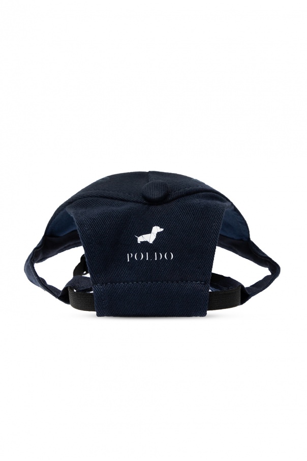 Navy blue dog baseball cap from Dsquared2 x Poldo Dog Couture. Crafted from distressed cotton with time-worn effects, this item showcases black adjustable straps, yellow-white-red logo-embroidered patch and white graphic print.