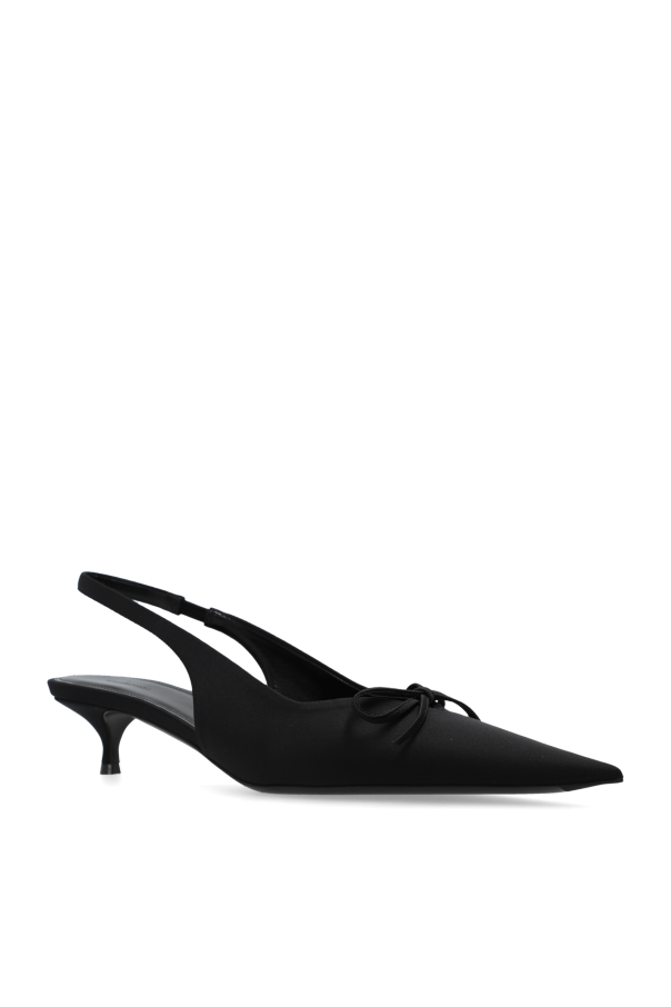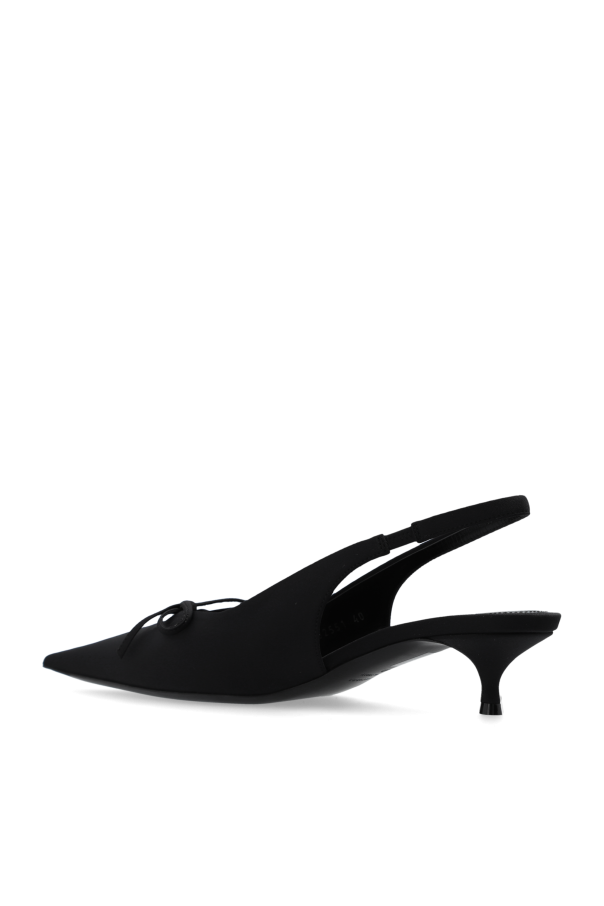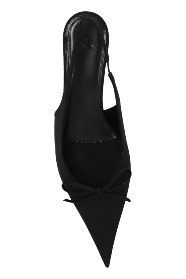 Introducing the 'Knife Bow' heels by Balenciaga, a testament to the harmonious blend of modern elegance and unconventional style. Crafted with meticulous attention to detail, these heels boast a sleek, black finish that encapsulates the essence of sophisticated chic. The elongated, pointed toe silhouette, combined with a subtly tapered heel, exudes an air of refined grace, making these shoes a versatile addition to any wardrobe. The 'Knife Bow' heels are distinguished by their smooth, glossy exterior, likely crafted from high-quality leather or its finest imitation, ensuring both durability and a luxurious appearance. A statement-making, decorative bow adorns the front, lending an element of refined opulence and distinguishing these heels as a piece de resistance in any fashion ensemble. Designed as mules, their open-heel construction ensures ease of slip-on functionality, melding comfort with unparalleled style. The interior is lined with leather, promising a comfortable fit, while the rubber sole offers reliable traction, ensuring these heels are as practical as they are stylish. Whether showcased on their own or as part of a comprehensive outfit on a model, the 'Knife Bow' heels by Balenciaga stand out for their minimalist design and elegant aesthetic, making them suitable for a myriad of occasions, from casual gatherings to more formal events. Why Purchase the 'Knife Bow' Heels? Elegant and modern design with a distinctive decorative bow High-quality materials including a glossy exterior and leather lining Comfortable mule style with an open heel for easy wear Versatile black color that complements various outfits Subtle yet stylish tapered heel for a refined look Crafted by the renowned designer house, Balenciaga, ensuring exclusivity and sophistication