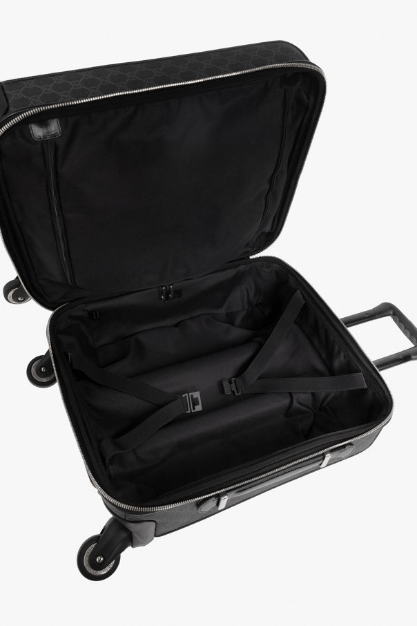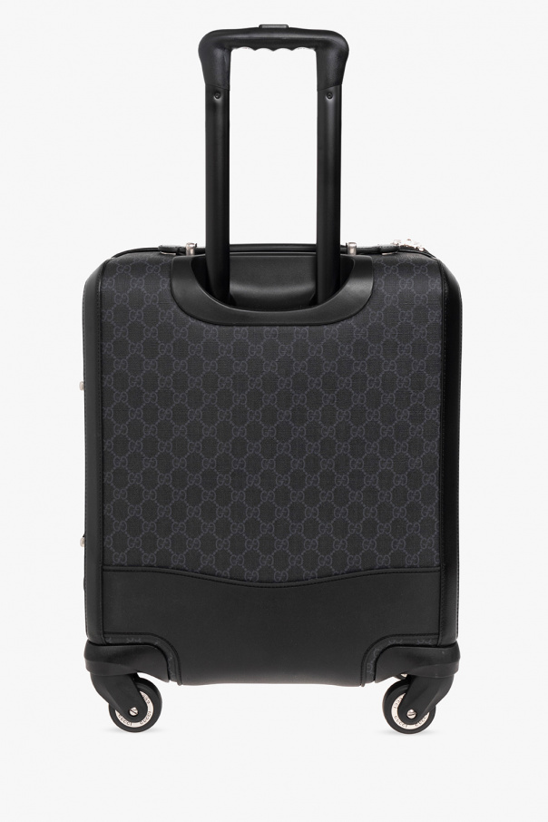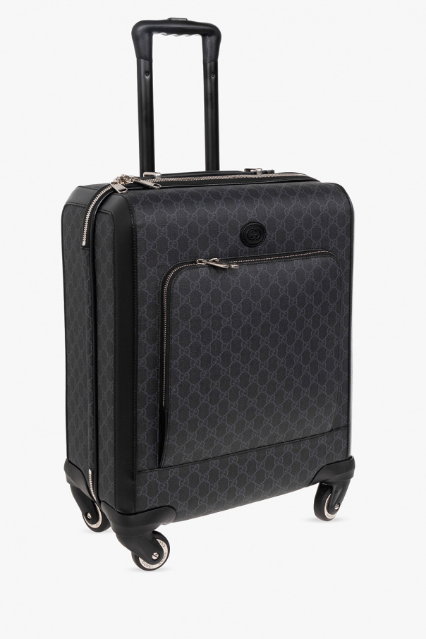 Black suitcase on wheels from Gucci. Crafted from canvas and leather, this model features a two-way zip, GG monogram pattern, patch, front zip pocket, half-round handle, two internal compartments and silver-tone metal hardware.