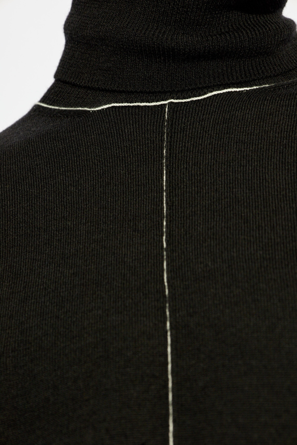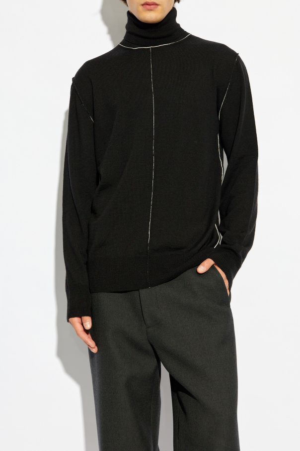 Introducing the epitome of refined sophistication, the MM6 Maison Margiela Wool Turtleneck in a classic black hue. Crafted from a luxurious blend of wool and acrylic, this turtleneck sweater exemplifies the haute couture craftsmanship synonymous with the Maison Margiela lineage. Its high, standing collar gracefully envelops the neck, providing warmth and elegance in equal measure. The sweater's distinctiveness lies in its meticulous design details - contrasting white stitches that trace the centerline, collar, shoulders, and sleeves. These decorative seams not only accentuate the garment's structure but also imbue it with a modern and unique character, setting it apart from conventional offerings. The smooth and uniform texture of the fabric speaks to the careful finishing, placing emphasis on subtle details and quality craftsmanship over overt branding. Adhering to a minimalist aesthetic, this turtleneck features long sleeves with standard-length cuffs and a ribbed hem, maintaining a clean and simple silhouette devoid of pockets or fastenings. This design choice underscores the garment's sleek and uncluttered appeal. Why Purchase This Product? Exquisite blend of 70% wool and 30% acrylic, offering unparalleled comfort and durability. Signature contrasting white stitches elevate the visual appeal, adding a contemporary twist to a classic silhouette. Minimalist design with a focus on high-quality materials and subtle detailing, perfect for discerning fashion enthusiasts. Crafted by the renowned MM6 Maison Margiela, a testament to luxury and innovative design.