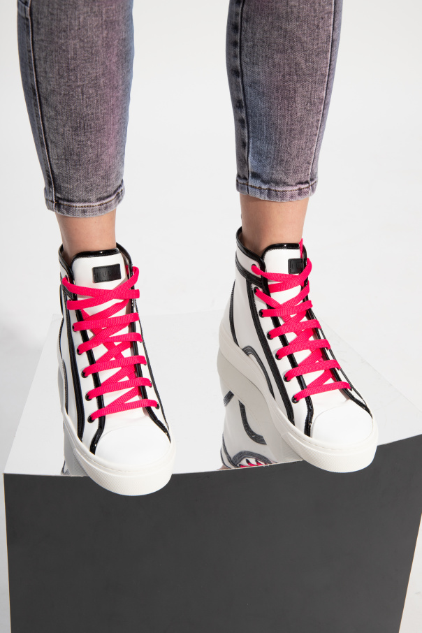 White, black and pink ‘Binding’ sneakers from Furla. Trimmed with leather, this lace-up design features a patch with a raised logo and a white rubber sole.