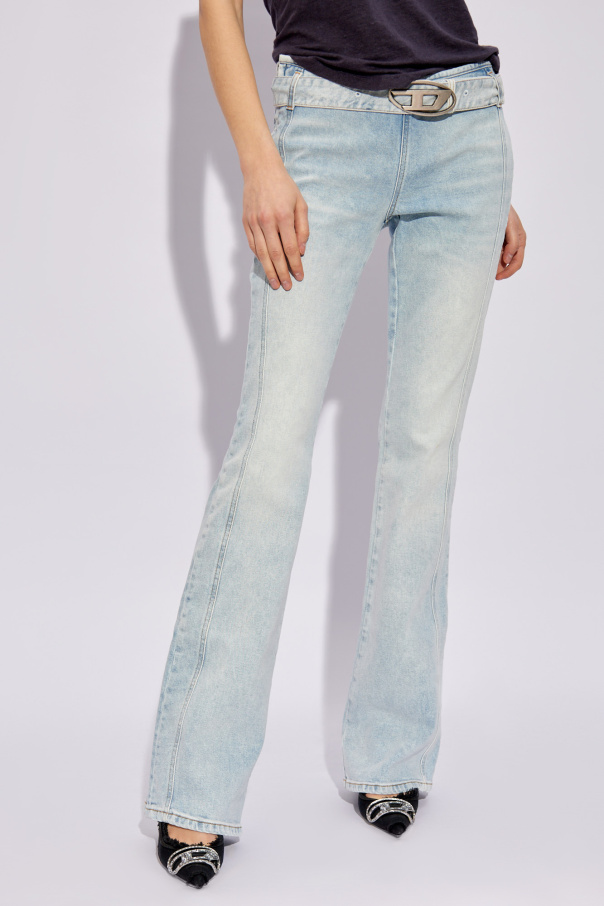 Light blue ‘D-EBBYBELT-S’ jeans from Diesel. Falling with flared legs, this pair features a side zip and an attached belt with a silver-tone logo buckle.