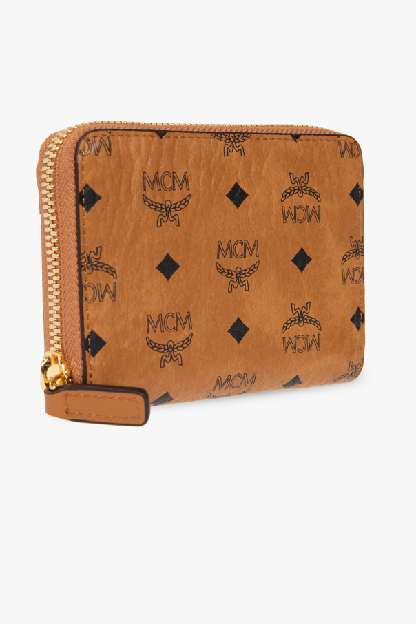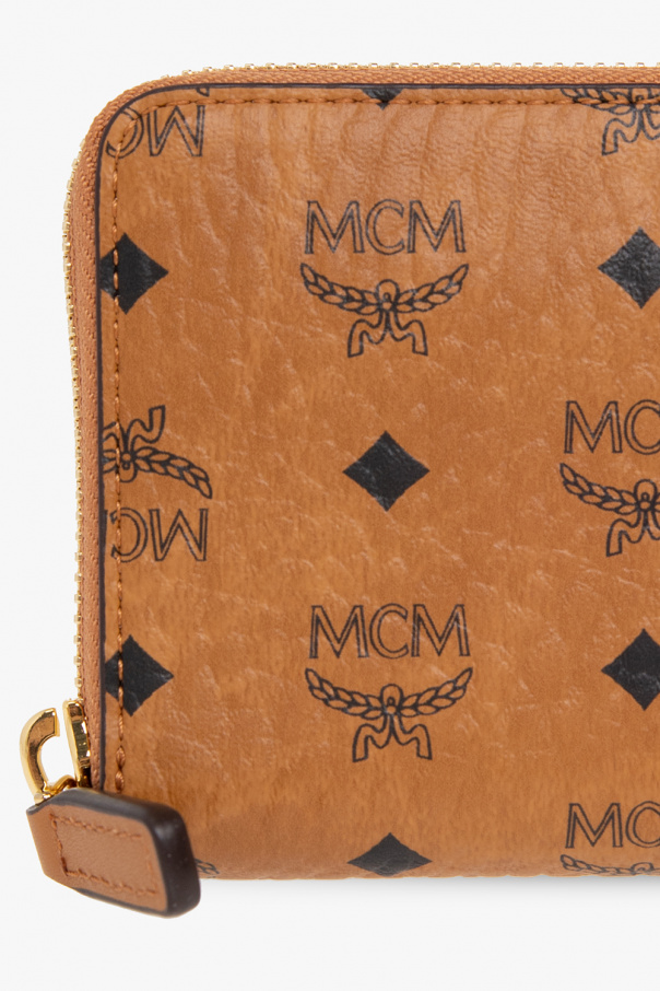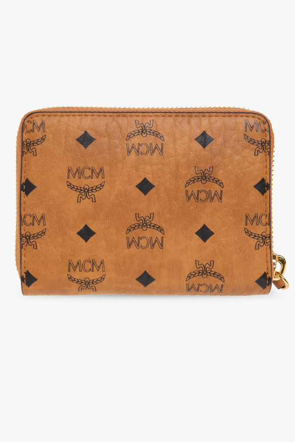 Brown wallet from MCM. Made of faux leather, this item features a zip fastening and printed Visetos logo in black. It has two internal compartments with one zipped coin pocket and three card slots inside.