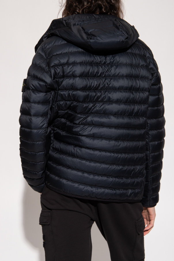 Navy blue quilted jacket from Stone Island. Emblazoned with a black, green and yellow logo patch, this style features a two-way zip fastening, two zip pockets, a drawcord-adjustable hood and elasticated trims on the bottom hem and cuffs.