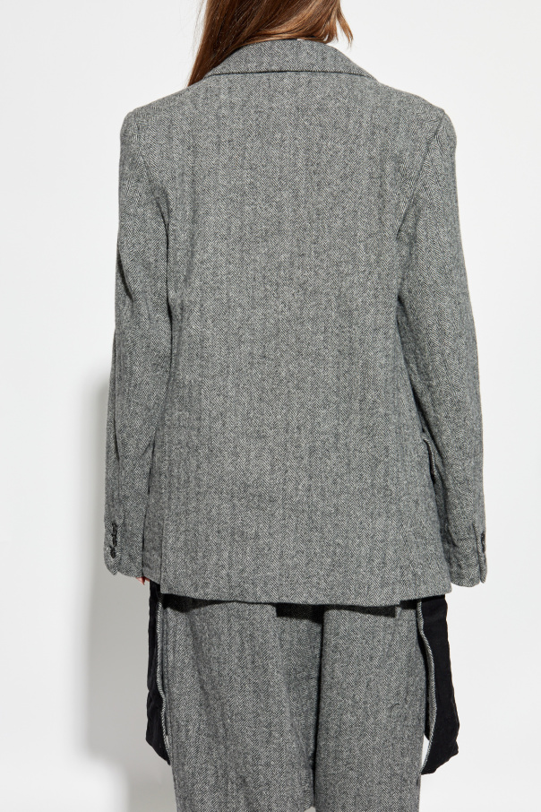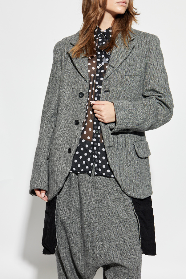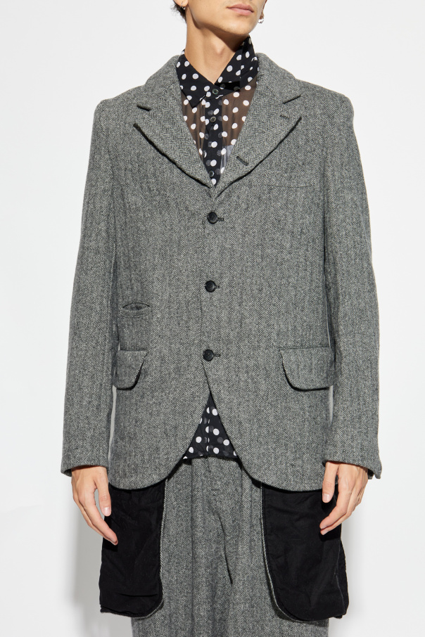 Presenting the Wool Blazer from the exclusive collection by Comme des Garçons Black. This meticulously crafted piece embodies timeless elegance and modern sophistication. The blazer features a classic, straight cut with a subtle waist taper, broad lapels, and a three-button closure. Made from luxurious wool, it showcases a delicate herringbone pattern that enhances its refined appearance. The dominant shade of gray ensures versatility, making it a perfect match for various wardrobe elements. This exquisite blazer includes two front flap pockets and a single chest pocket on the left side, offering both functionality and style. The interior and additional side elements are finished with a contrasting black lining, adding a touch of distinction to the overall design. As a unisex garment, this blazer is designed to be worn by both women and men, making it a versatile addition to any wardrobe. Its elegant yet everyday appeal makes it suitable for a range of occasions. Why Choose This Product? Crafted from high-quality wool for a luxurious feel and timeless look. Classic, straight cut with a modern waist taper for a flattering fit. Versatile gray color with a delicate herringbone pattern. Functional design with two front flap pockets and one chest pocket. Contrasting black lining for added elegance. Unisex design suitable for both women and men.