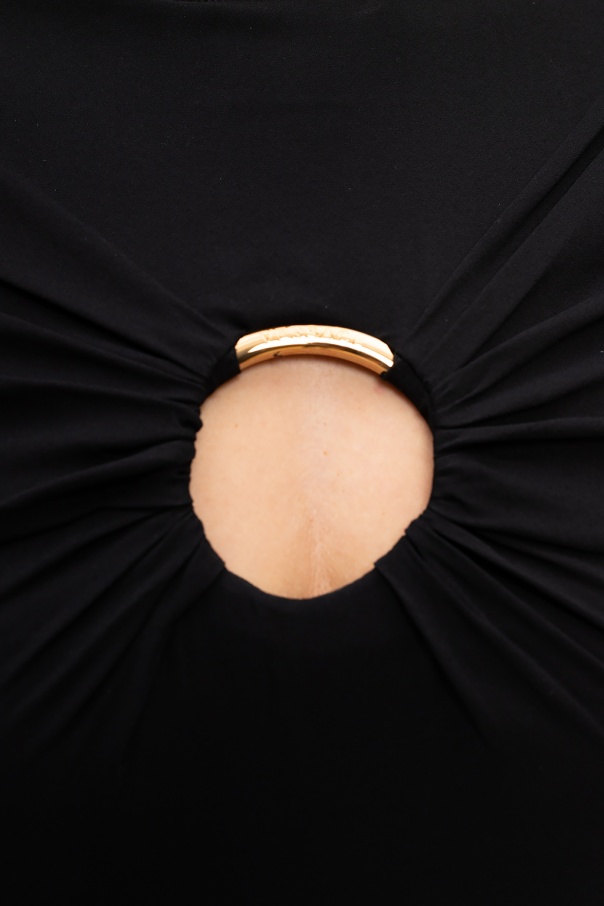 Black body from Versace. Fastened with hooks & eyes and a zip, this design is enriched with gathers and round logo elements in gold-tone.