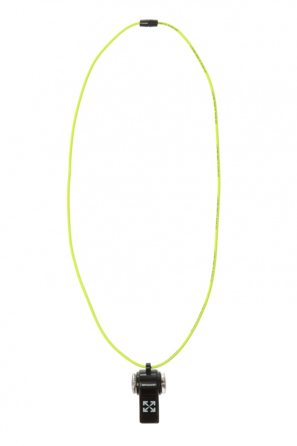 Black whistle with compass and thermometer from Off-White. Comes with neon green strap.