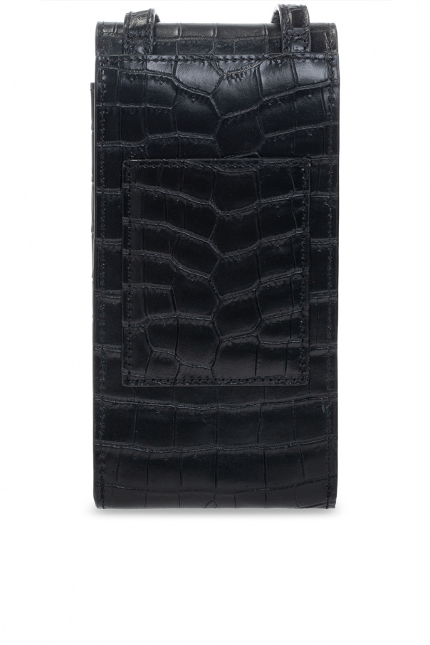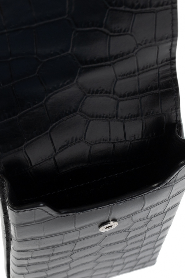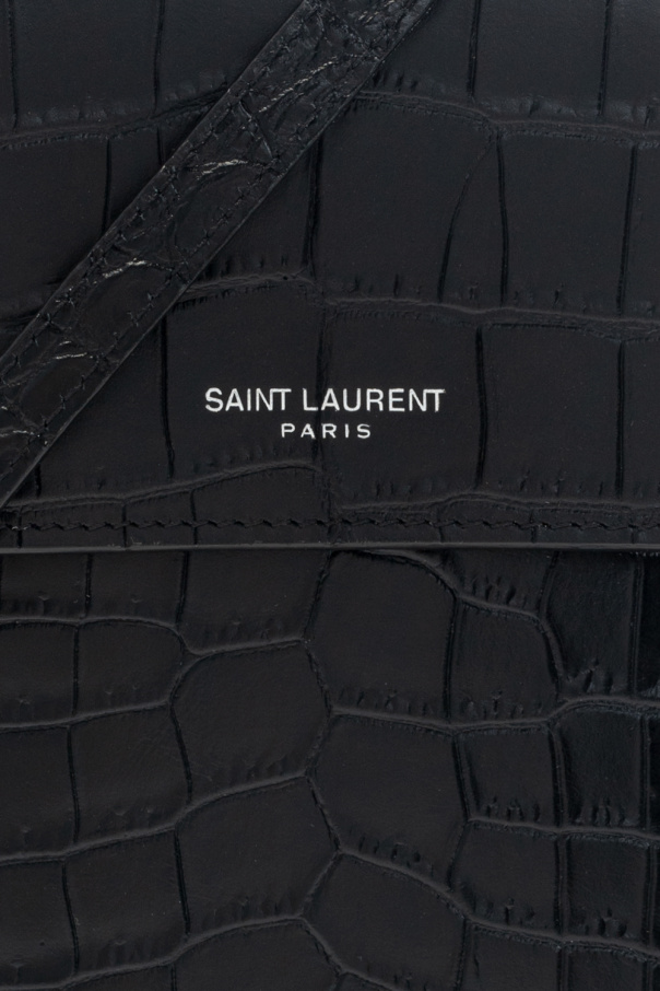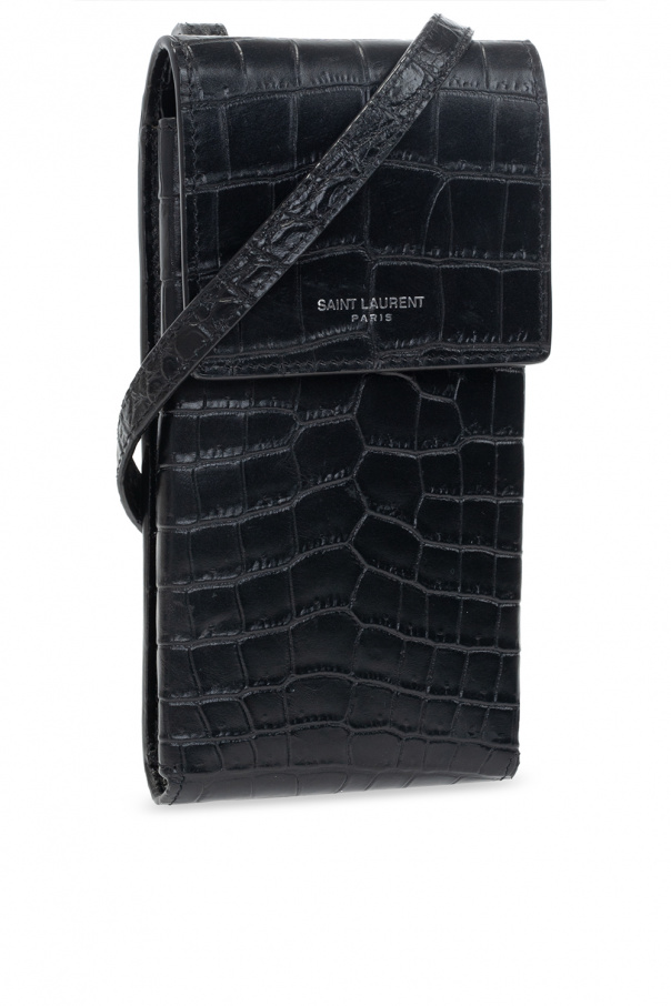 Black ‘Paris’ phone pouch from Saint Laurent. Crafted from calf leather with a crocodile skin effect, this model fastens with a snap and is complete with a back card slot, adjustable strap, one internal compartment and silver-tone metal hardware.