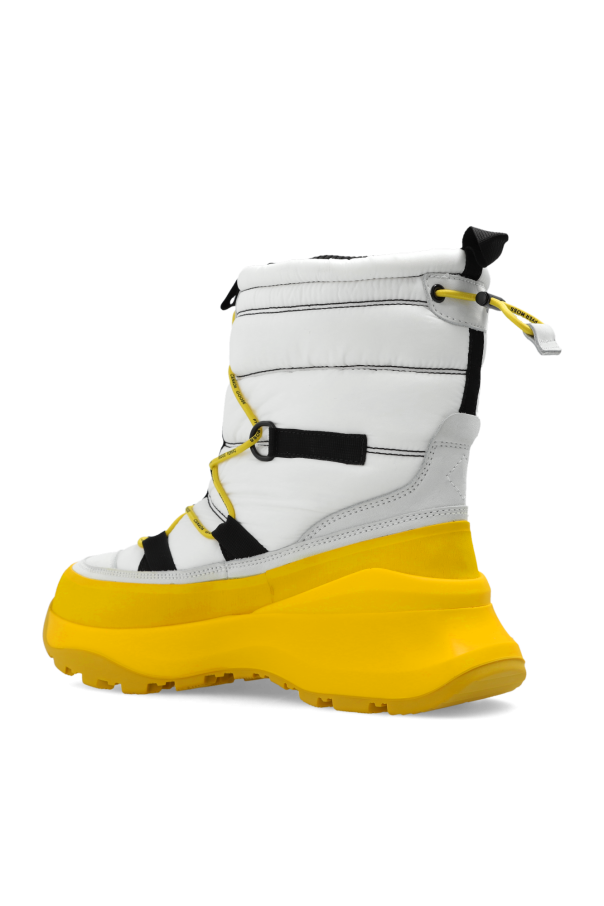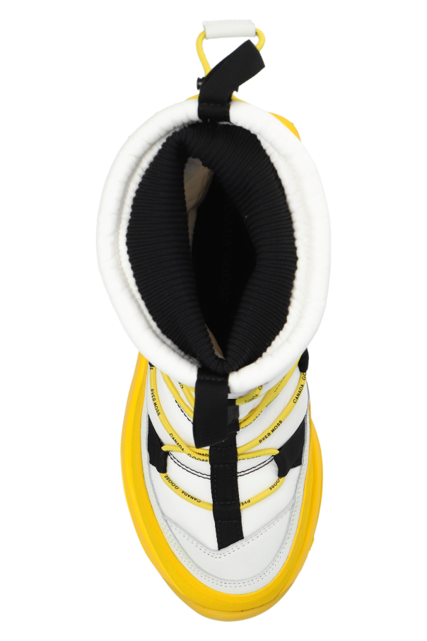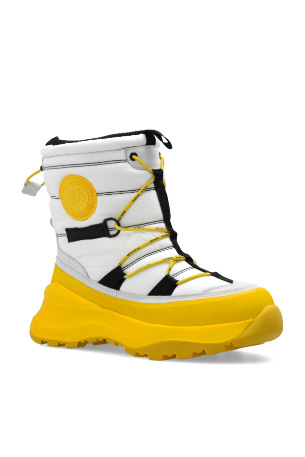 White and yellow ‘Wild Brick’ quilted snow boots from Canada Goose x Pyer Moss. Made of fabric with leather trims, this pair sits on a yellow rubber sole and features lacing on the front, drawstrings at the back, elasticated cuff and logo patch to the side.