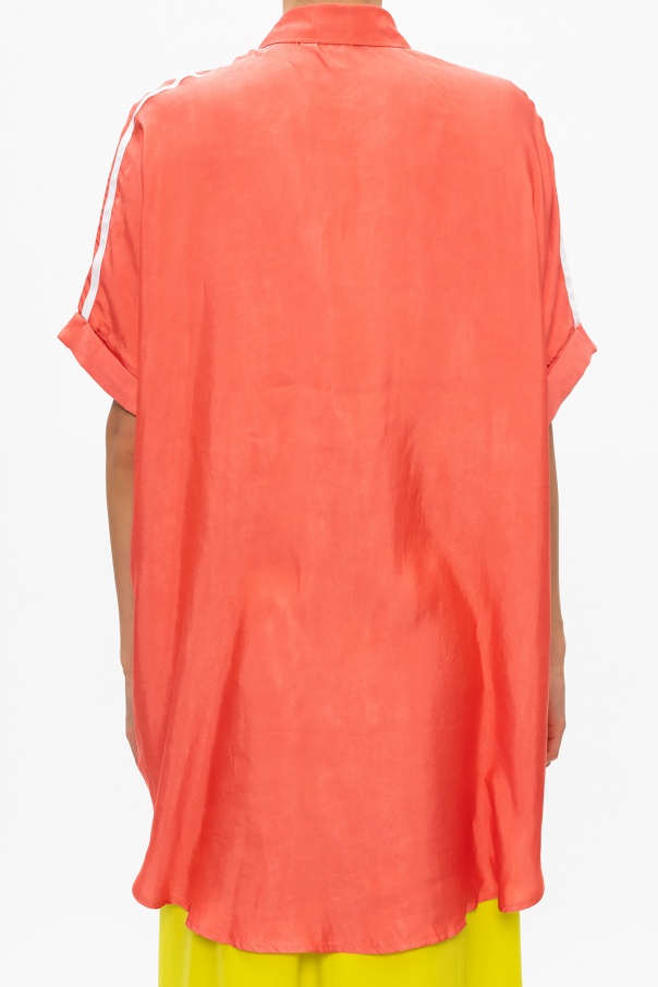 Orange short sleeve shirt from ADIDAS Originals. Made of crisp, satin-like fabric, this loose-fit piece fastens via buttons with a concealed placket and employs short sleeves enhanced by the brand's signature three stripes, a chest pocket printed with white logo and an asymmetrical, curved droptail bottom hem.