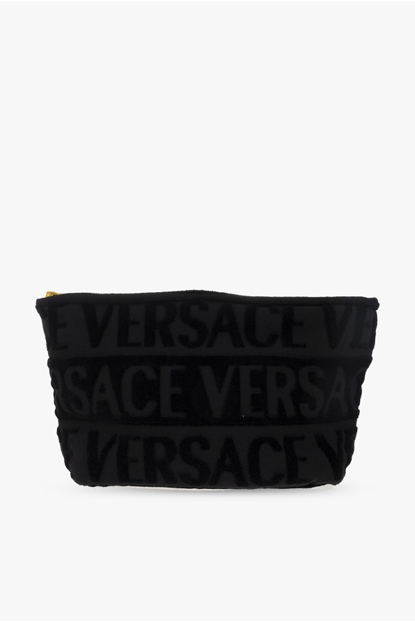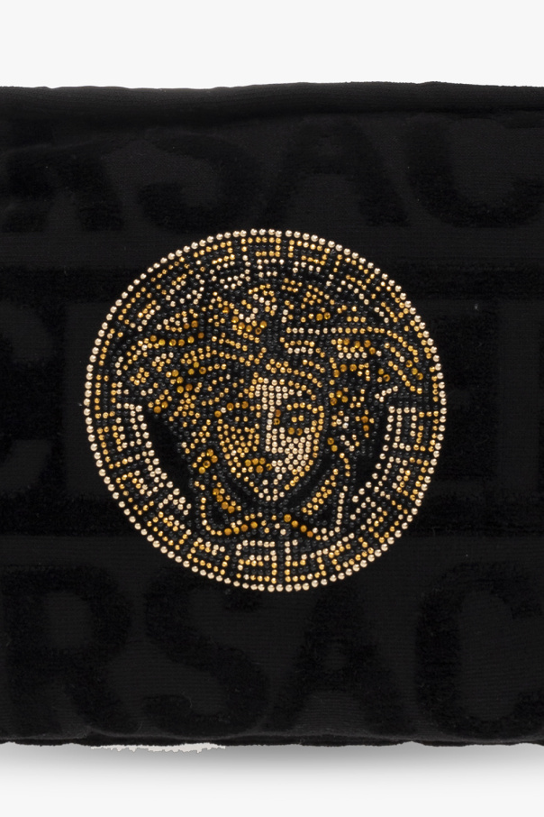 Black, yellow and orange wash bag from Versace Home. Crafted from terry cotton, this design showcases the brand's logo, its signature Barocco pattern and a sequinned Medusa motif. It is complete with a zip fastening and one internal compartment.