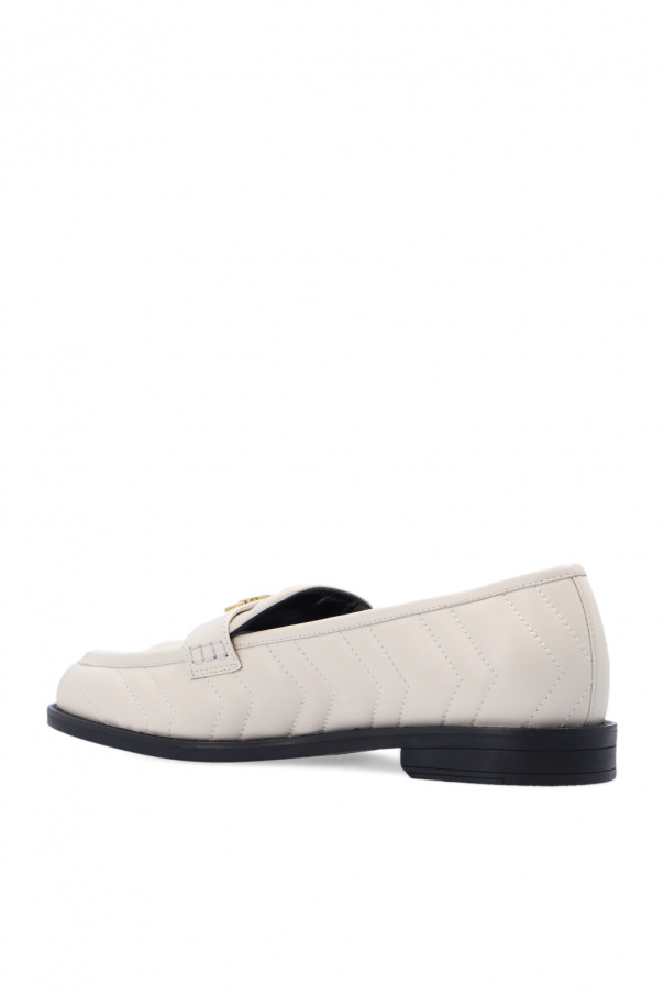 Cream quilted moccasins from Gucci. Crafted from leather, this pair features a gold-tone logo appliqué and black rubber sole.