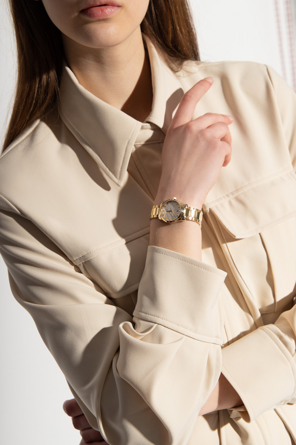 Silver-tone 'G-Timeless' quartz watch from Gucci. Made of stainless steel and scratch-resilient glass. Equipped with glare-shield. Features cream and gold-tone dial with black logo. Water-resistant up to 50m.