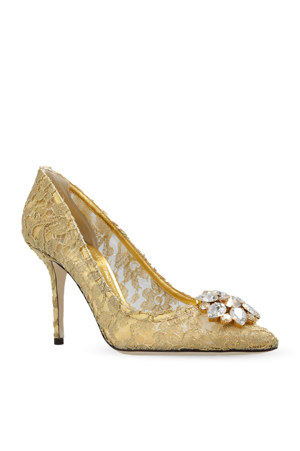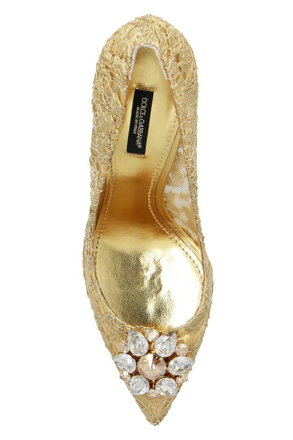 Gold-tone lace stiletto pumps from Dolce & Gabbana. Resting on a beige leather sole, this pointed toe pair is decorated with crystals.