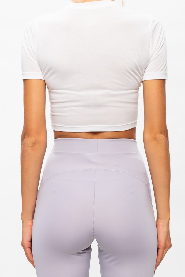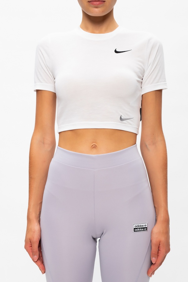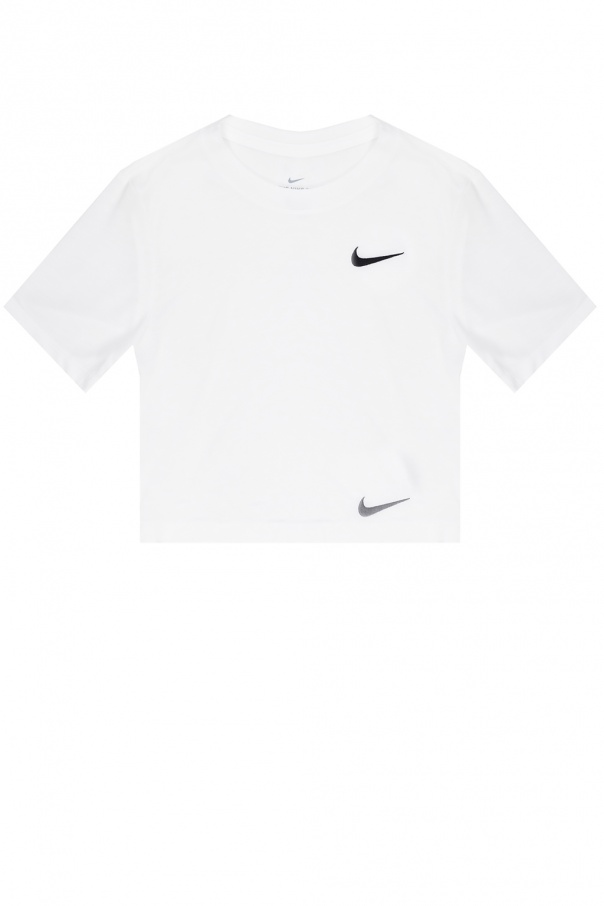 White cropped T-shirt from Nike. This round neck design comes decorated with logo embroidery in black and grey.