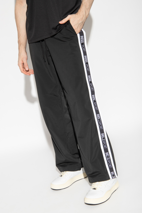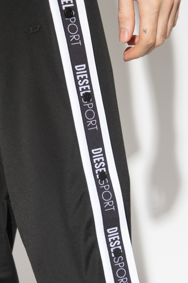 Black and white 'AMSB-HORACE-HT14' trousers from Diesel, the ‘DIESEL SPORT’ collection. Enriched by branded panels down the sides, this pair features a drawstring waistband, two front slip pockets and snap closures on the sides.