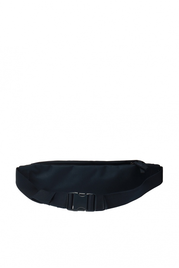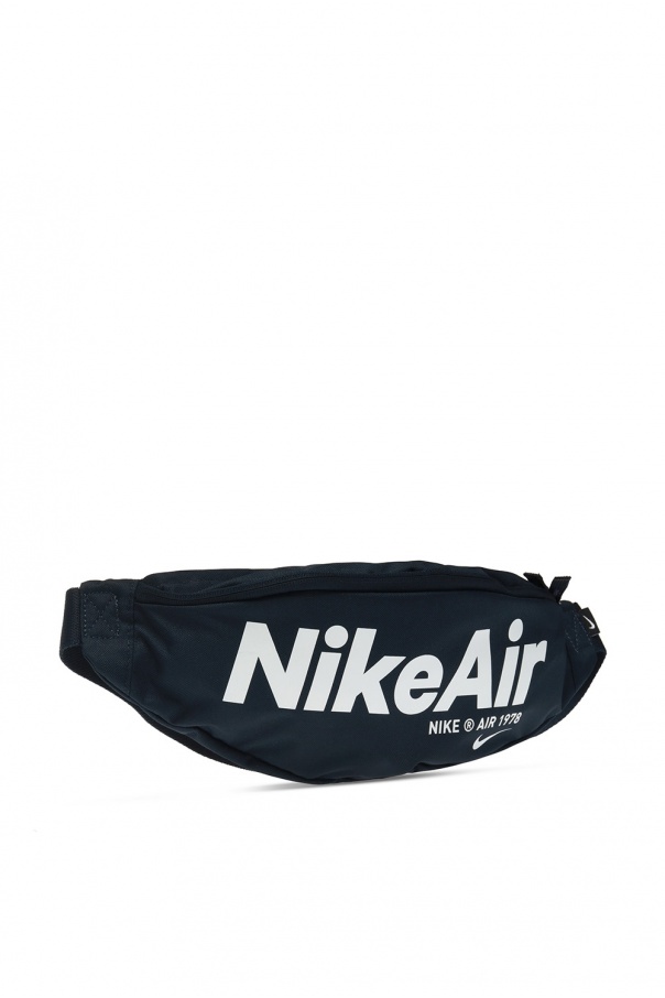 Navy ‘Air Heritage 2.0’ belt bag from Nike. Fastened with a two-way zip. Decorated with a white logo print. Two-way zip pocket at the back. Adjustable buckle belt. Main internal compartment with a zip pocket made of mesh. Silver-tone metal hardware.