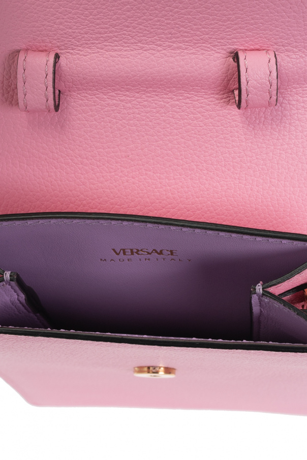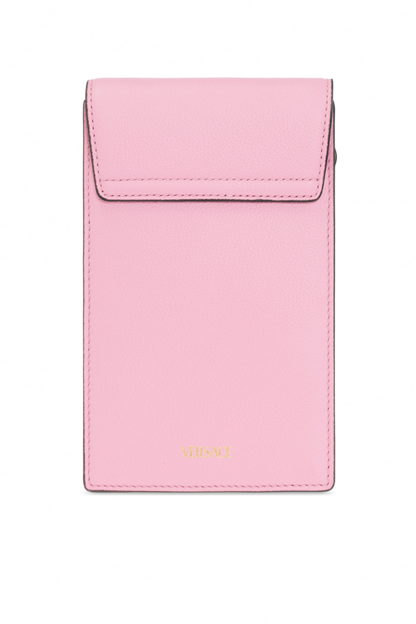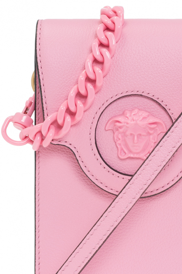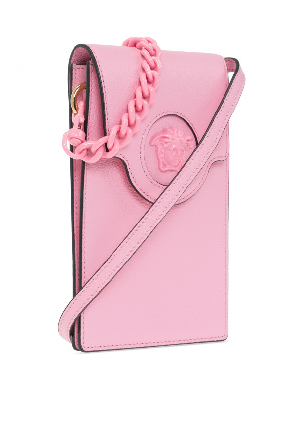 Pink phone holder from Versace. Made of leather, this model fastens with a magnetic snap and is complete with the label’s signature Medusa head and gold-tone logo print. It is complete with a detachable half-round chain handle, detachable and adjustable strap, one internal compartment and gold-tone metal hardware.