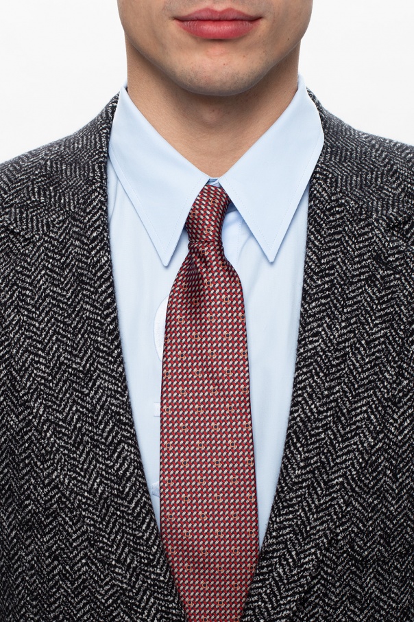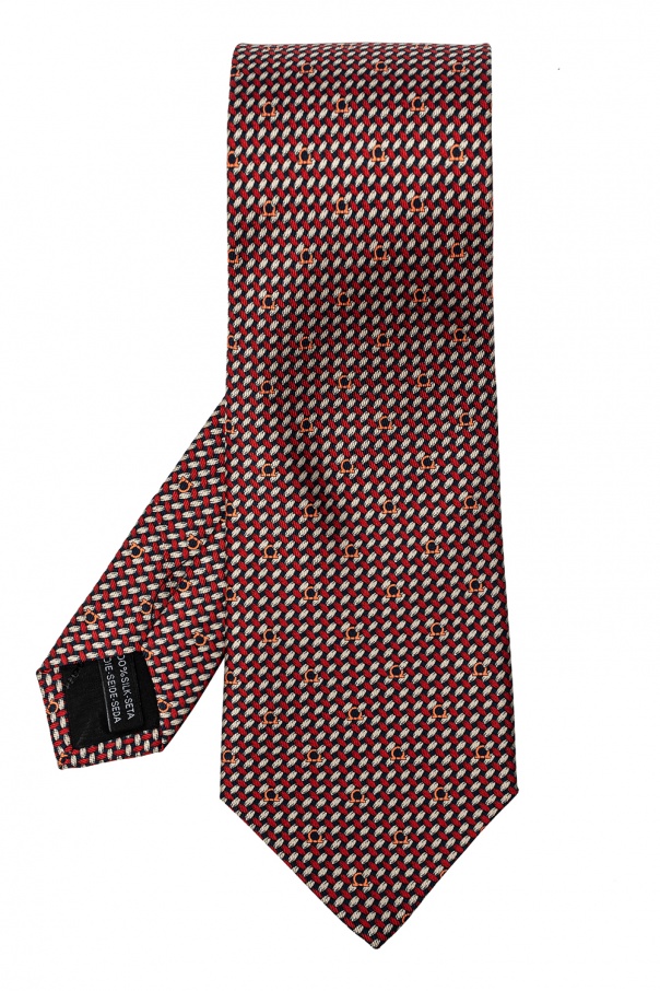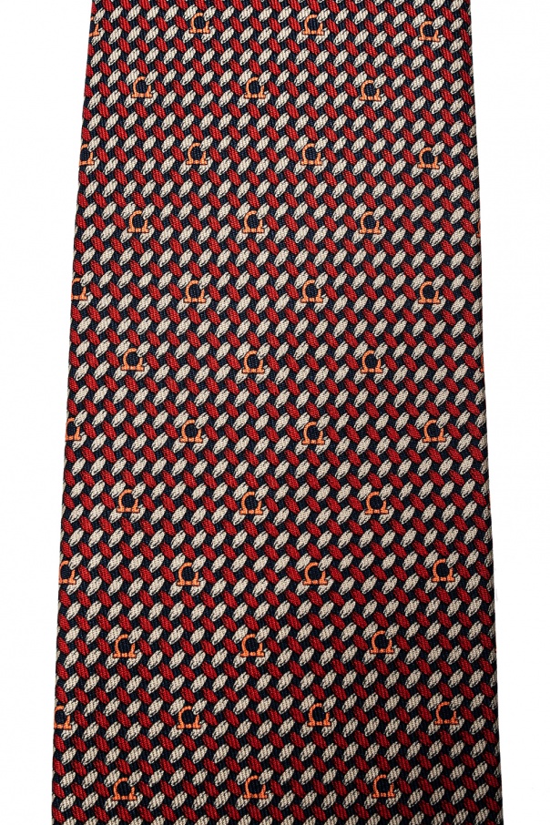 Red tie from Salvatore Ferragamo. Woven from silk, this accessory showcases Gancini motif.