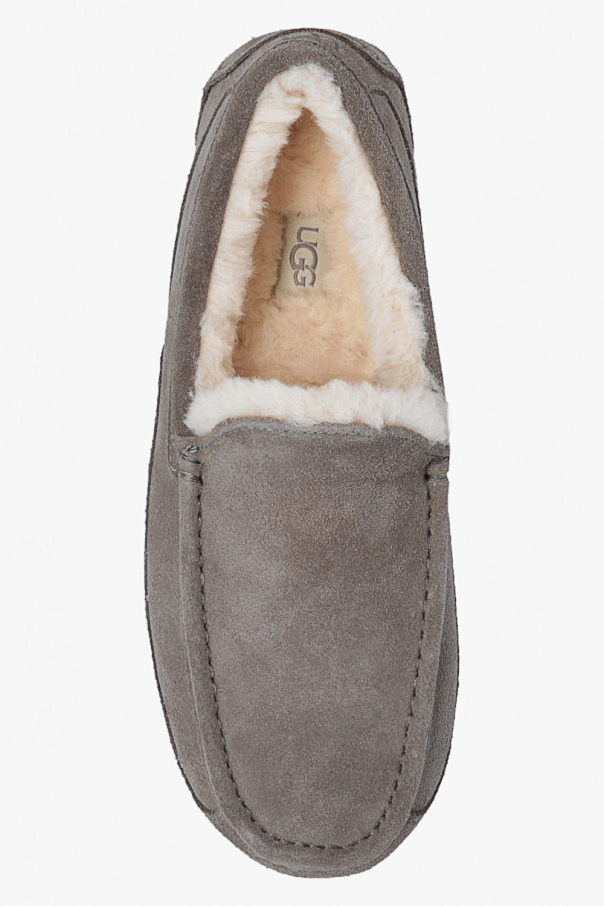 Grey ‘Ascot’ shearling moccasins from UGG. Crafted from suede and insulated with cream sheep wool, this model features exposed stitching details, an embossed logo and a black rubber sole.