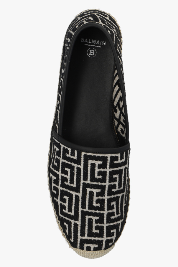 Cream and black platform espadrilles from Balmain. Crafted from canvas and leather, this pair features a monogram embroidery and beige woven jute sole with black rubber trimming.