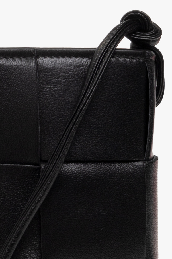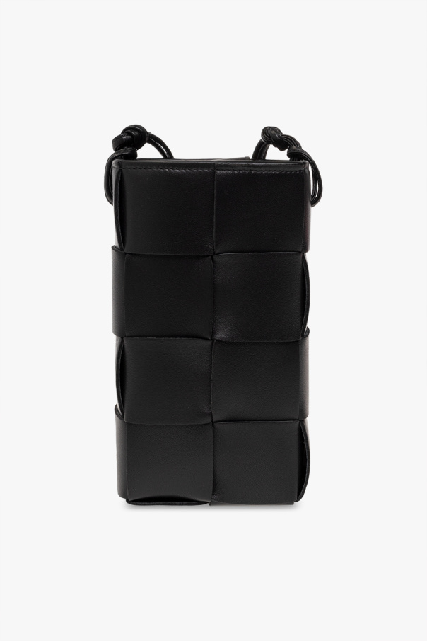 Black phone case from Bottega Veneta. Made of calf leather with the brand’s signature Intrecciato weave, this model features a magnetic snap, double shoulder strap with knot details and one internal compartment.