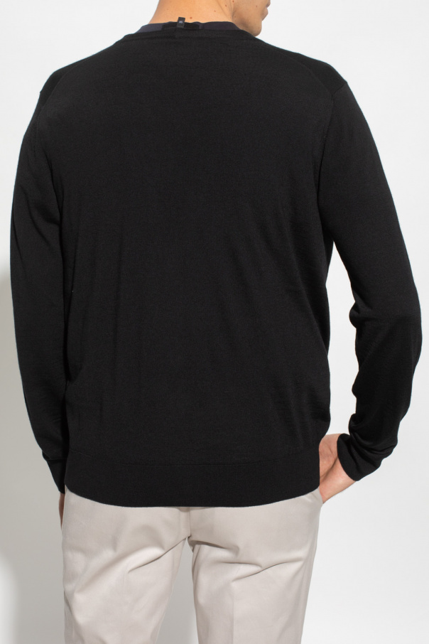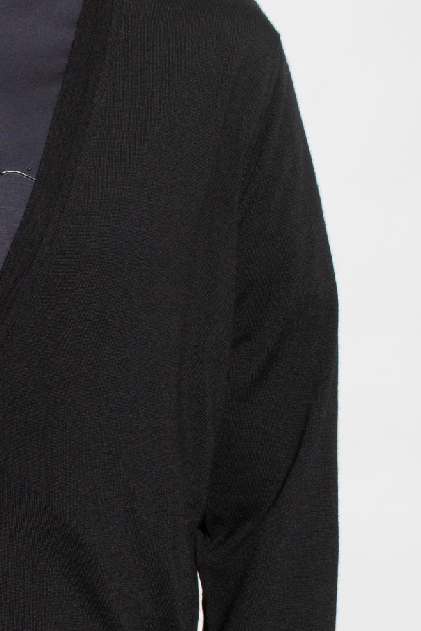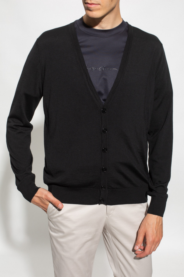 Black cardigan from Giorgio Armani. Made from wool, this style features a V-neckline, long sleeves and button fastenings.