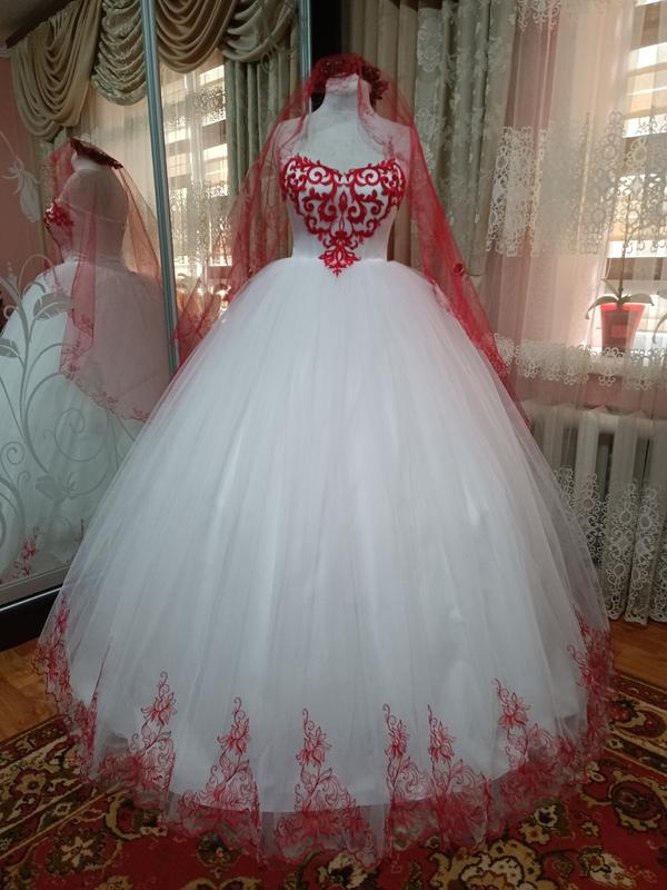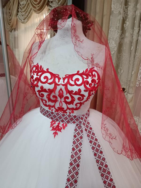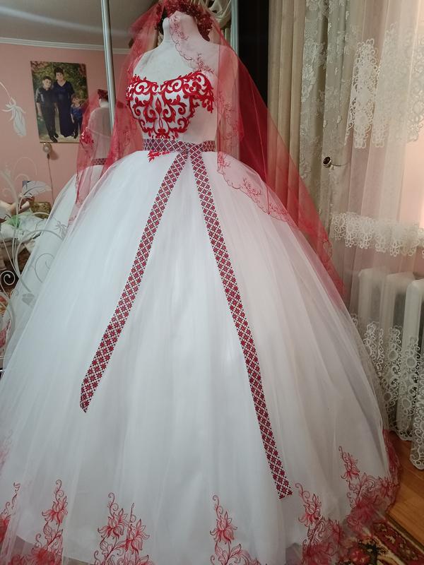 Изысканное свадебное платье в украинском стиле. Вышивка красными нитями. Корсет регулируется шнуровкой.Фата, венчик, и подъюпник продается отдельно. Замеры пишите в приват