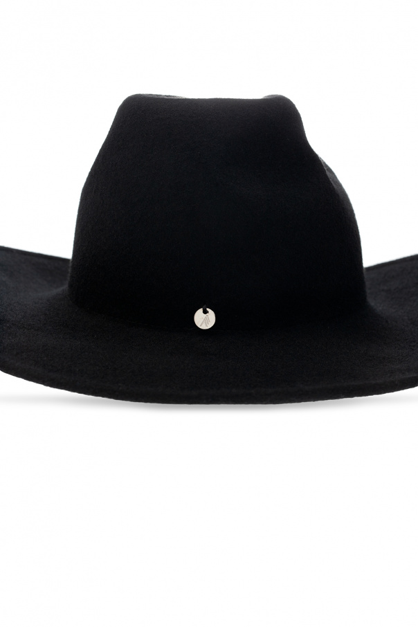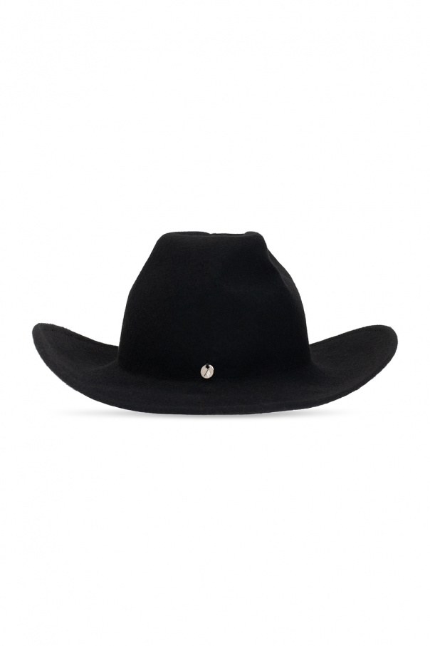 Black ‘Cowboy’ wide-brim hat from The Attico. Crafted from felt with black jacquard lining, this item is decorated with a silver-tone logo appliqué.
