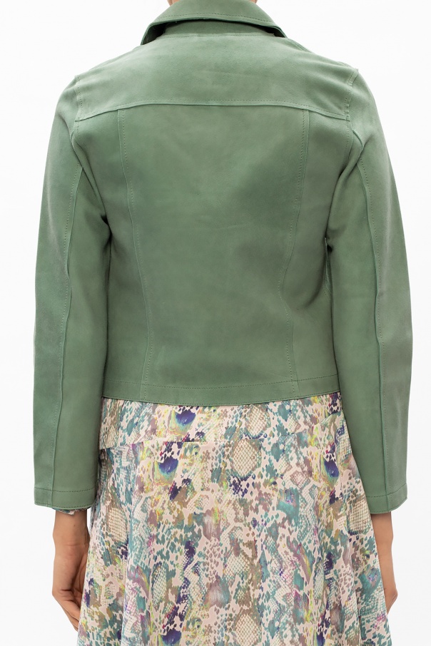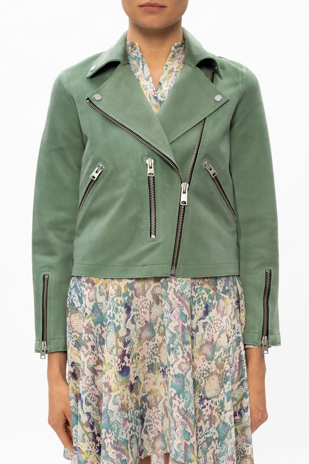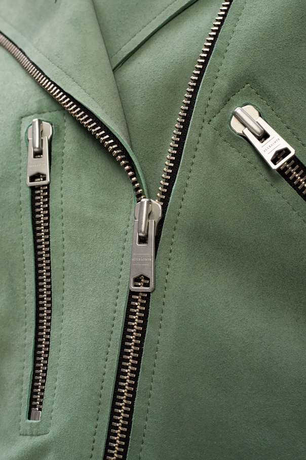 Green ‘Unlined’ biker jacket from AllSaints. Crafted from suede, this design features a zip fastening and three zip pockets on the front.